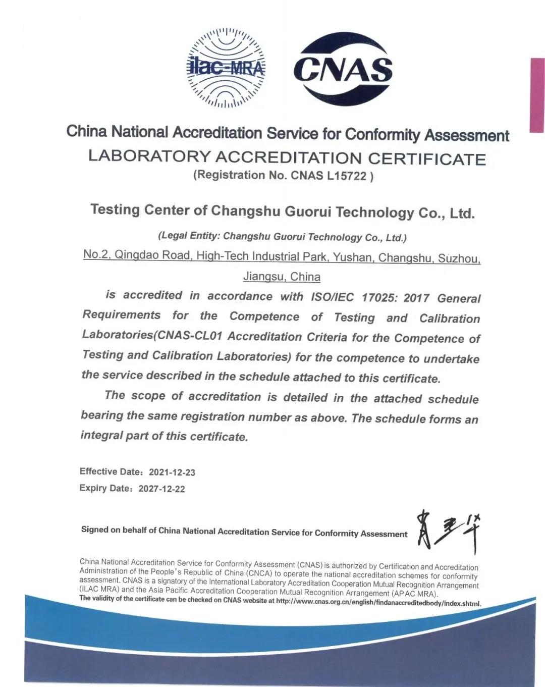 本次獲得CNAS認(rèn)可資質(zhì)證書,標(biāo)志著國瑞科技公司檢測中心具備國家及國際認(rèn)可的硬件條件、檢測技術(shù)和管理水平,是對檢測中心專業(yè)技術(shù)水平、檢測能力的客觀肯定。同時(shí)該中心可依據(jù)國際認(rèn)可準(zhǔn)則開展檢測服務(wù),出具的檢測結(jié)果在行業(yè)內(nèi)具有更高的認(rèn)可度和公信力,為客戶提供更優(yōu)質(zhì)高效的服務(wù),為國瑞科技公司產(chǎn)品的可靠性保駕護(hù)航,增強(qiáng)市場競爭能力。