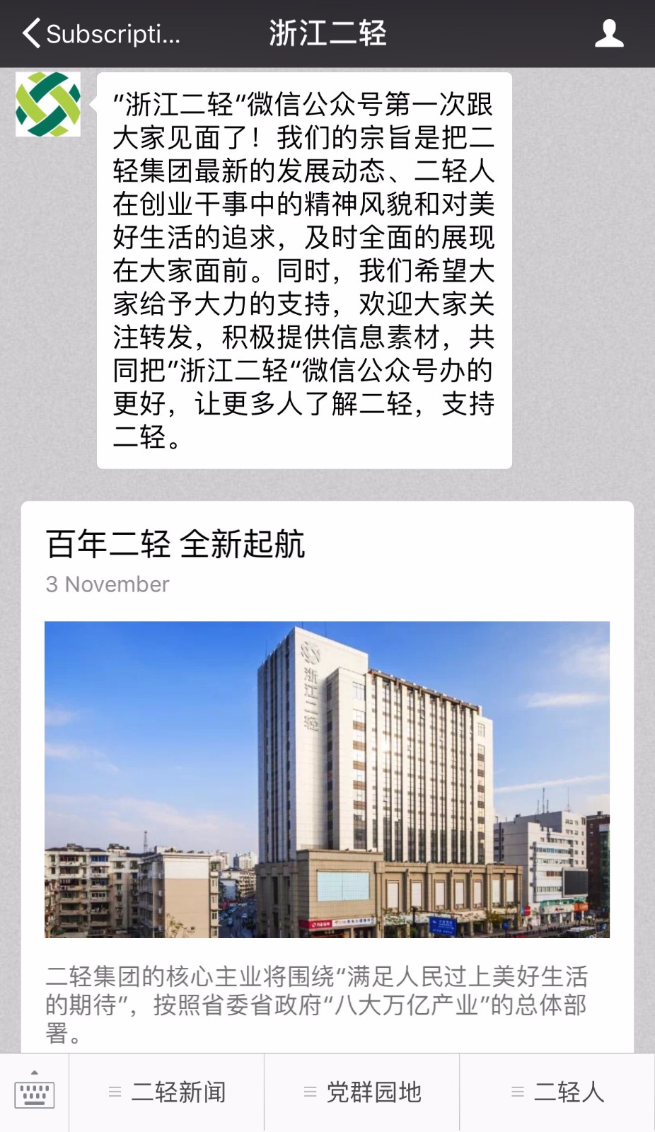 ”浙江二輕“微信公眾號第一次跟大家見面了!我們的宗旨是把二輕集團最新的發(fā)展動態(tài)、二輕人在創(chuàng)業(yè)干事中的精神風(fēng)貌和對美好生活的追求,及時全面的展現(xiàn)在大家面前。同時,我們希望大家給予大力的支持,歡迎大家關(guān)注轉(zhuǎn)發(fā),積極提供信息素材,共同把”浙江二輕“微信公眾號辦的更好,讓更多人了解二輕,支持二輕。